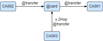 Example: find an intermediate card with alias 'agent' that satisfies conditions as shown in the image below: Card CA002 transfers money to Card CA001 via agent; agent is a neighbor to Card CA003 within 2 hops