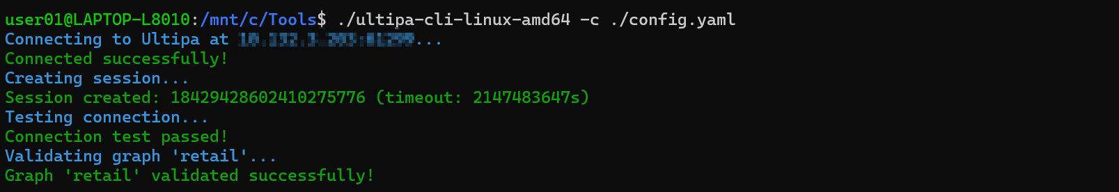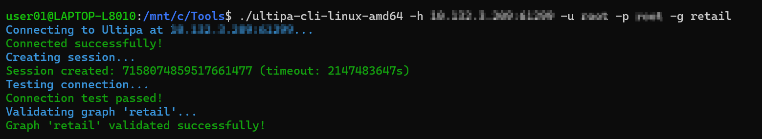The CLI will create a session, test the connection, and validate the graph you specify: