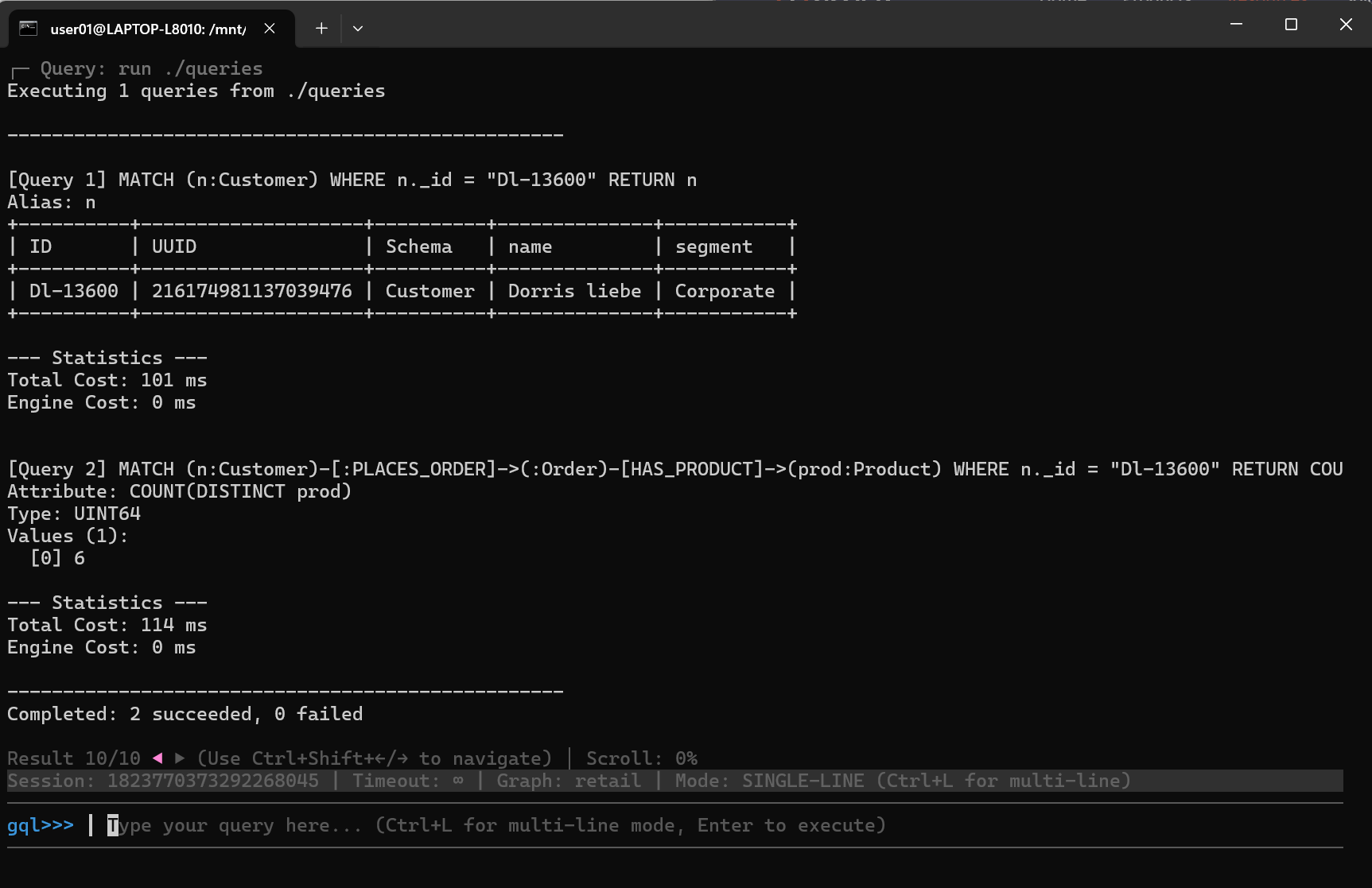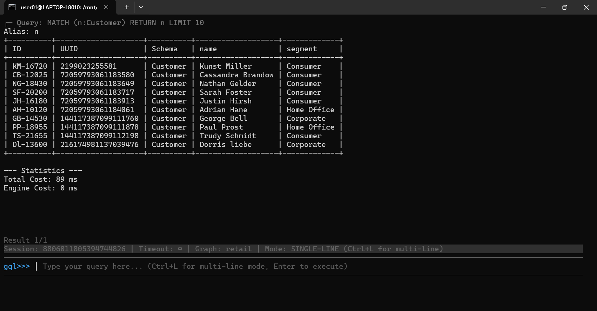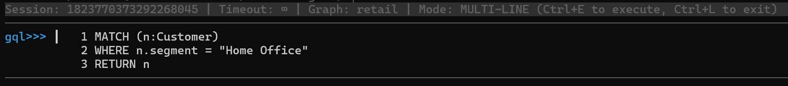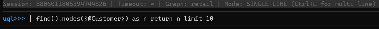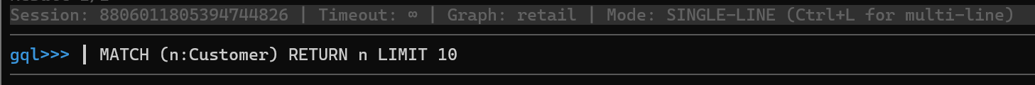 For example, to retrieve 10 Customer nodes from the current graph, type the following GQL and hit Enter:
