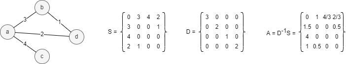 Soit S la matrice d'adjacence du graph G =(V,E), D la matrice de degré, et A la matrice de transition et A = D-1S. Voir l'exemple ci-dessous, le nombre sur chaque edge représente le poids de l'edge :