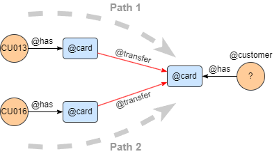 Exemple : comme le montre la structure de chemin dans le graph ci-dessous, trouver les clients qui ont reçu un transfert du Client CU013 et CU016, retourner avec toutes les propriétés.