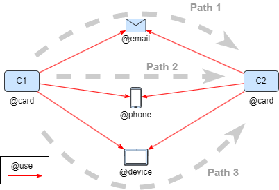 Exemple : comme le montre la structure de chemin dans le graph ci-dessous, trouver les informations de carte bancaire lorsque 2 cartes distinctes utilisent les mêmes adresses email, numéros de téléphone, dispositifs, retourner avec toutes les propriétés.