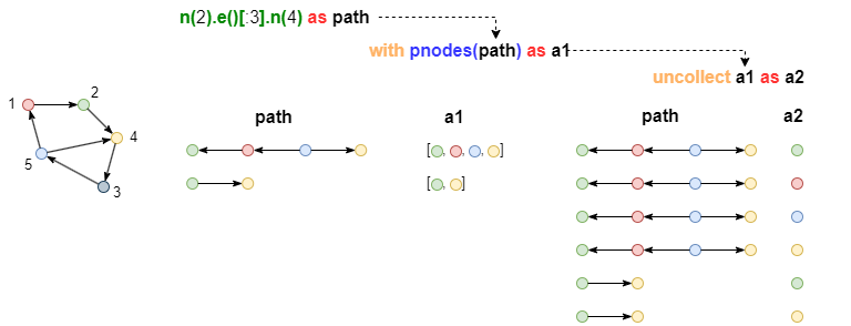 Exemple : Trouver des paths de 2 étapes de A à D, dédupliquer tous les nodes impliqués et retourner