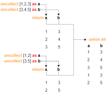 UNION ALL concatène les valeurs de retour ayant le même alias de deux RETURN de bout en bout et unit les données de chaque valeur de retour dans la même ligne en tant que ligne intégrée. Il a une efficacité opérationnelle plus élevée que celle de UNION puisqu'aucune déduplication n'est effectuée contre les lignes unies.