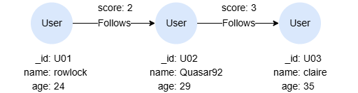 (:User {_id: "U01", name: "rowlock", age: 24})-[:Follows {score: 2}]->(:User {_id: "U02", name: "Quasar92", age: 29})-[:Follows {score: 3}]->(:User {_id: "U03", name: "claire", age: 35}) |