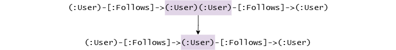 À la transition entre les groupes, deux modèles de node sont concaténés consécutivement. Ils sont combinés en un seul modèle de node avec toutes les conditions de filtrage fusionnées de manière conjonctive. Dans cet exemple, cela est simple puisque le seul filtrage appliqué est l'étiquette User