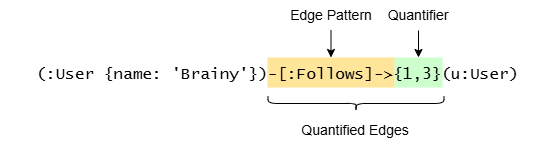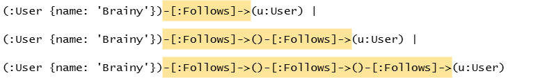MATCH (:User {name: 'Brainy'})-[:Follows]->{1,3}(u:User)