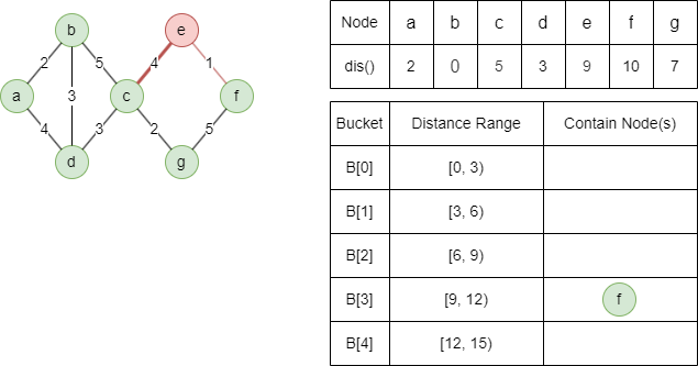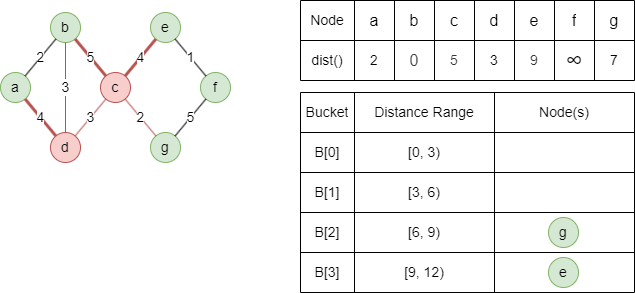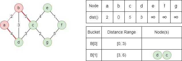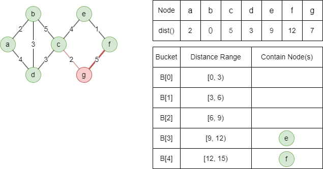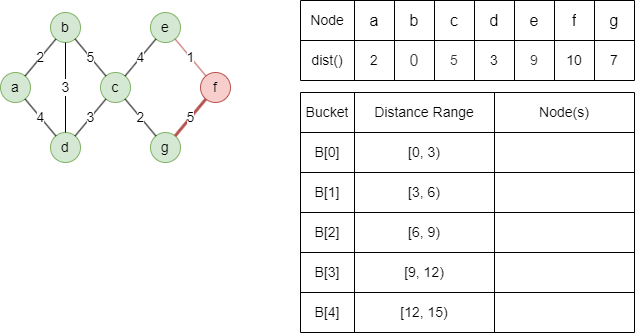 1. Au début de l'algorithme, tous les nodes ont une distance infinie sauf le node source qui est à 0. Le node source est assigné au bucket B[0].