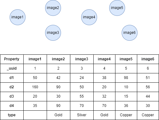 Le "graph" d'exemple possède 6 "nodes" d'image (les "edges" sont ignorés), et chaque "node" possède les "properties" d1, d2, d3, d4 et type: