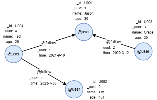 insert().into(@follow).edges({_from: "U002", _to: "U001", time: "2023-8-9"})