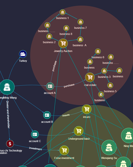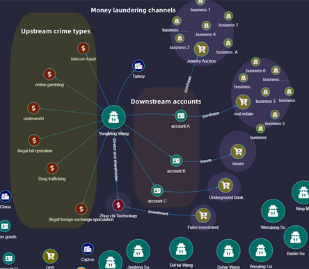 Meanwhile, spreading from any suspicious accounts, Wang Yongming for example, accounts involved in abnormal transactions such as dealers of precious metals, luxury goods, and real estate will be dug out. These accounts can further lead to uncover more clues such as black production.