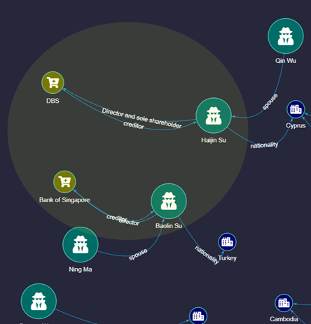 Furthermore, graph technology excels in screening and analyzing numerous corporate ownership structures, assisting banks in conducting periodic KYC checks and updating regulatory lists to continuously identify high-risk customers. In Figure 11, regulators can intuitively focus on the connections between DBS (Development Bank of Singapore) and suspect Su Haijin, and between Bank of Singapore and Su Baolin. They can conduct layer-by-layer drilling for deeper insights.