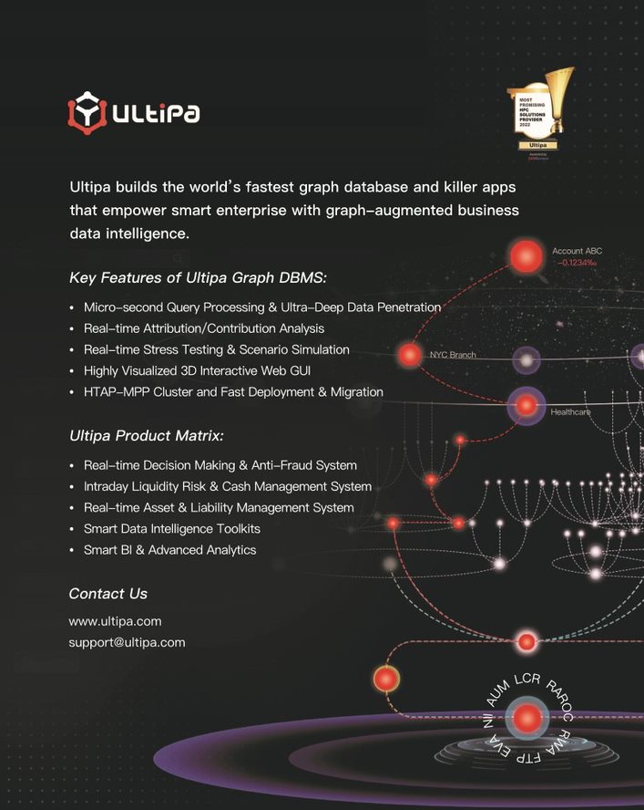 With its newly launched Version 4.0 of the graph database, Ultipa product matrix comprises both the core Ultipa graph database and killer applications like Ultipa Asset-liability Management Graph System, Ultipa Intraday Liquidity Management System, Ultipa Smart BI & Analytics, and Ultipa Smart Data Toolkits, and offers unique and unprecedented solutions for dozens of core and high-value business scenarios in BFSI and healthcare industries.